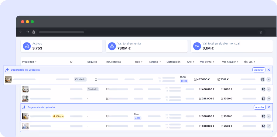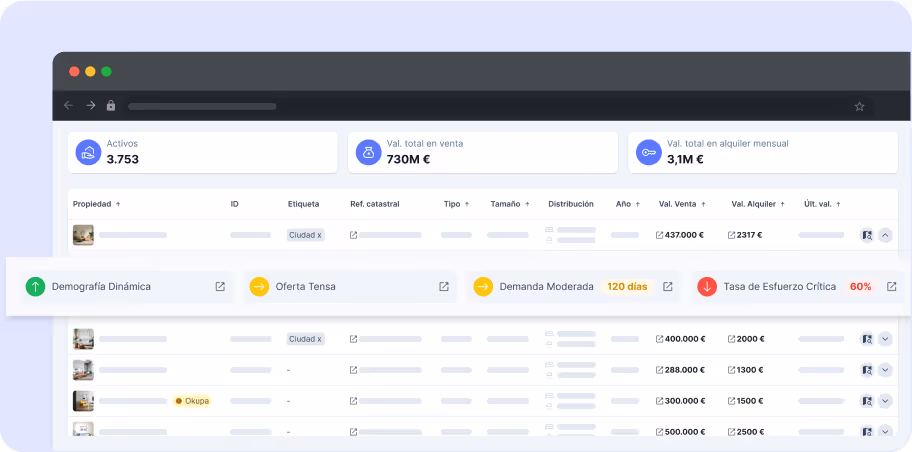 Valora miles de propiedades en segundos con alta precisión, sin necesidad de introducir datos uno a uno. Agrupa activos por zonas o estrategias con etiquetas personalizadas para filtrar, comparar y tomar decisiones más rápido.